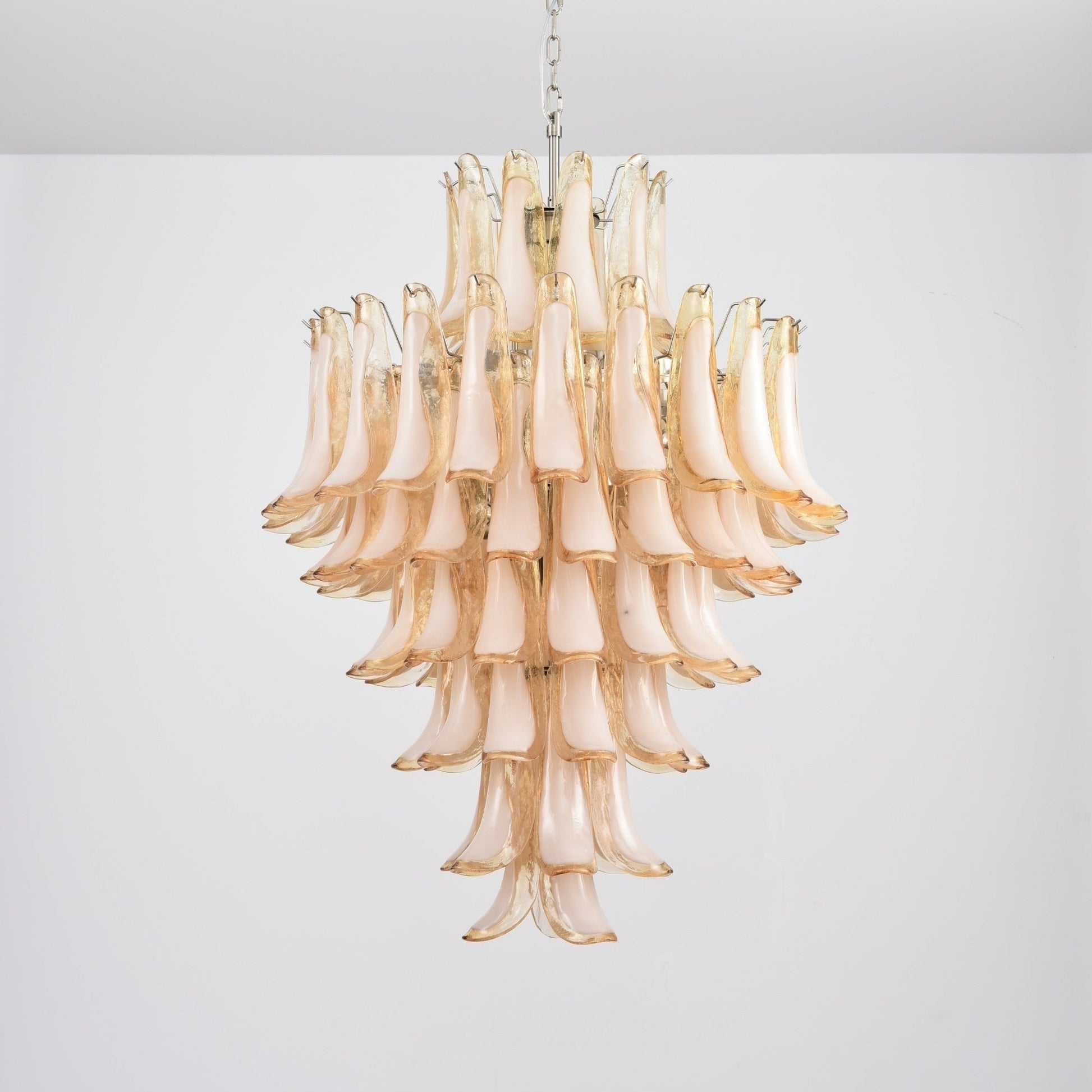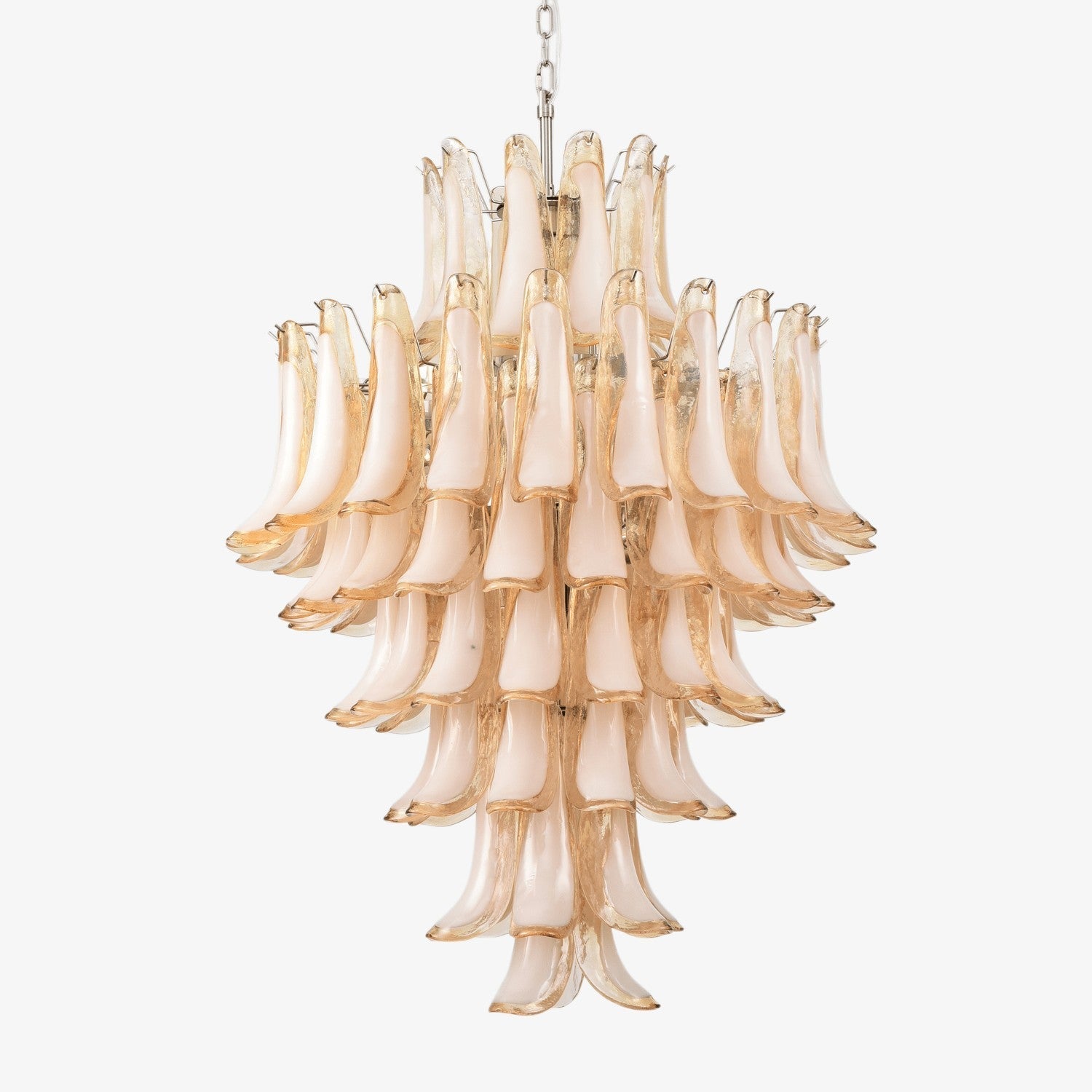 This chandelier feels like a glowing bouquet suspended in midair. Handcrafted glass petals fan outward in warm amber tones, diffusing light with a soft, luxurious glow. Inspired by classic Venetian techniques, it creates an atmosphere of elegance and drama—perfect for grand dining rooms, hotels, or statement interiors.