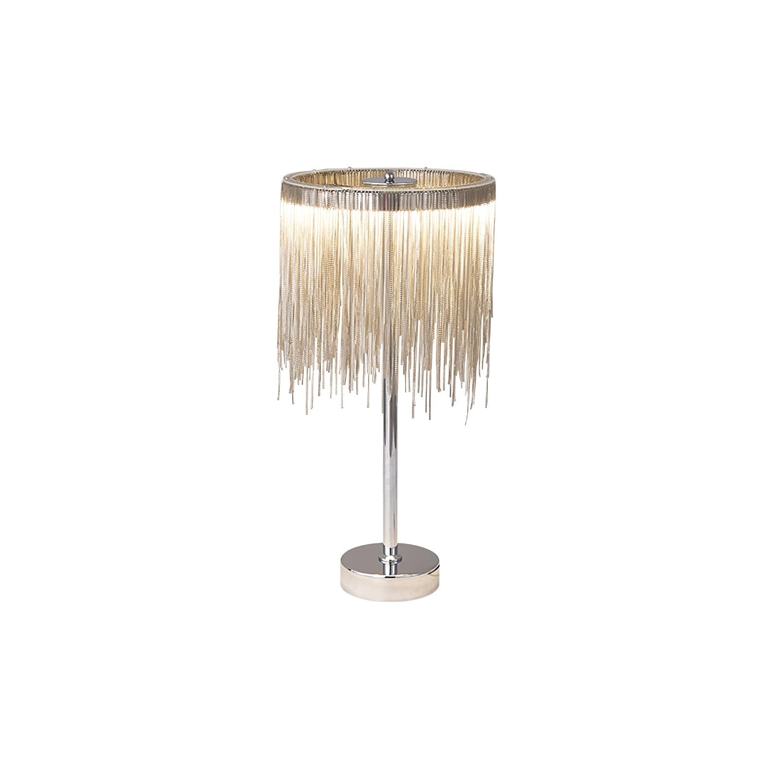 This statement table lamp transforms light into movement and texture. Hundreds of fine metal chains cascade from a sleek frame, catching and refracting the integrated LED glow for a dramatic, shimmering effect. It feels glamorous yet contemporary, making it an eye-catching feature for side tables, lounges, or boutique-style interiors.