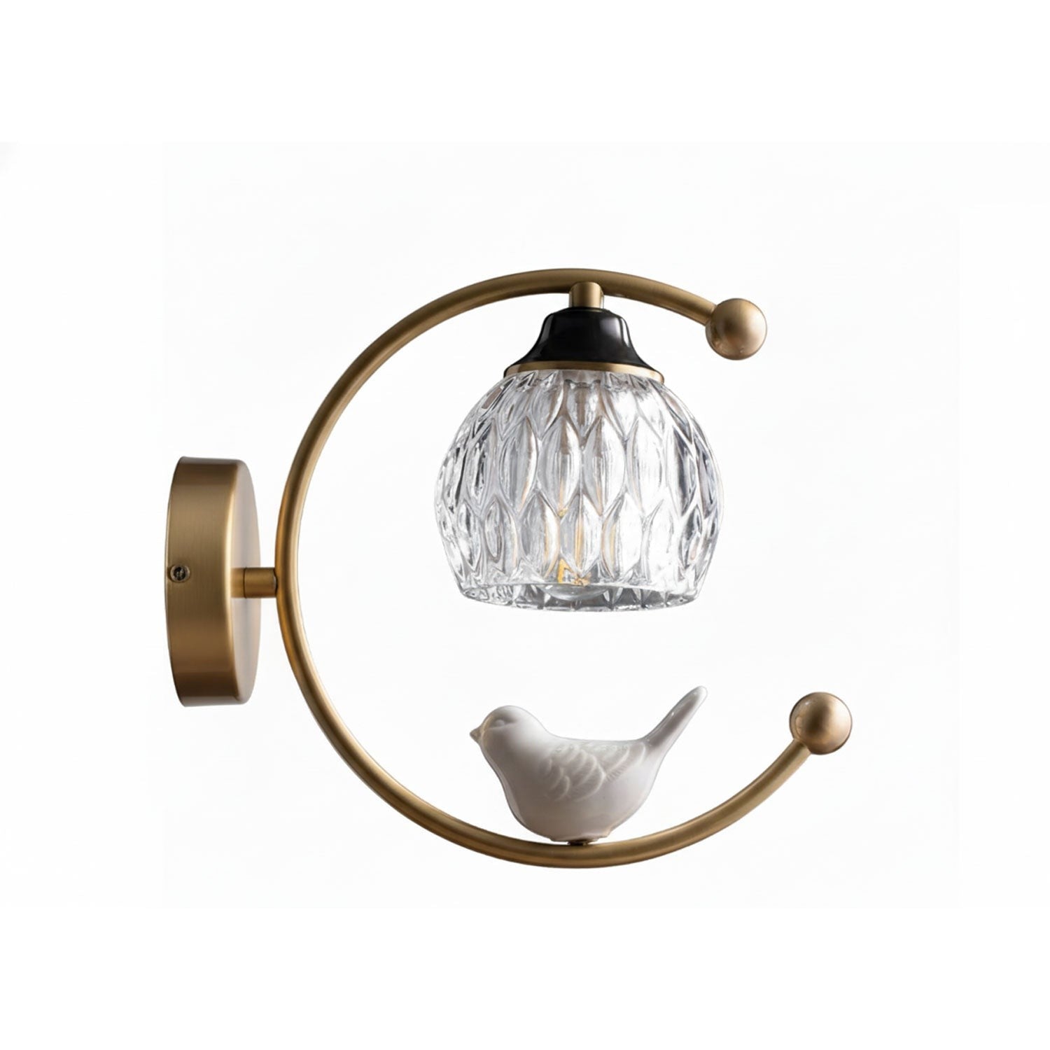 This wall light feels like a quiet design moment captured in time. A delicate ceramic bird rests above a softly textured glass shade, casting a warm, soothing glow across the wall. The mix of smooth porcelain, clear glass, and metal detailing creates a sense of balance and calm, making it a beautiful choice for bedrooms, hallways, or reading corners.