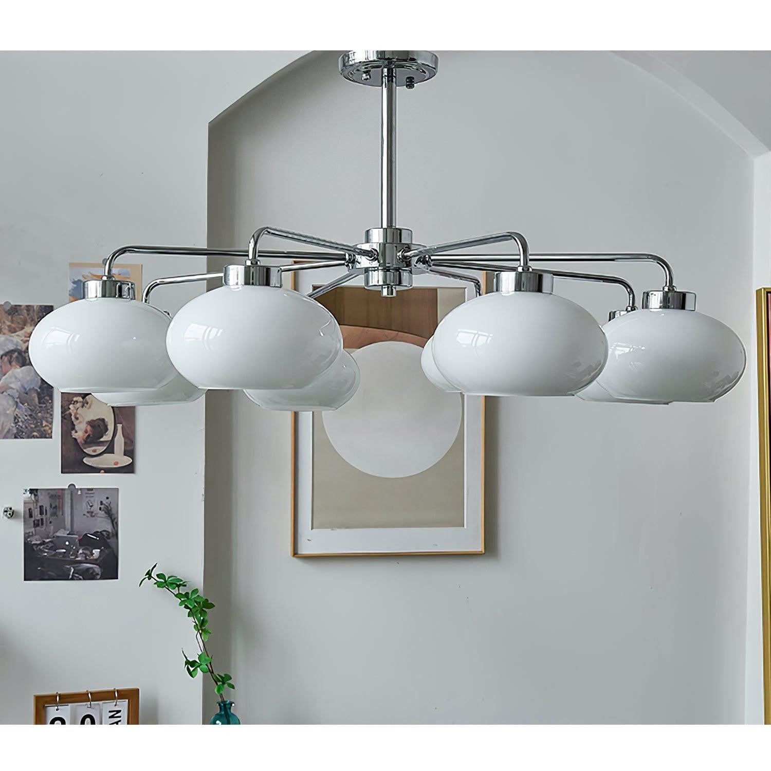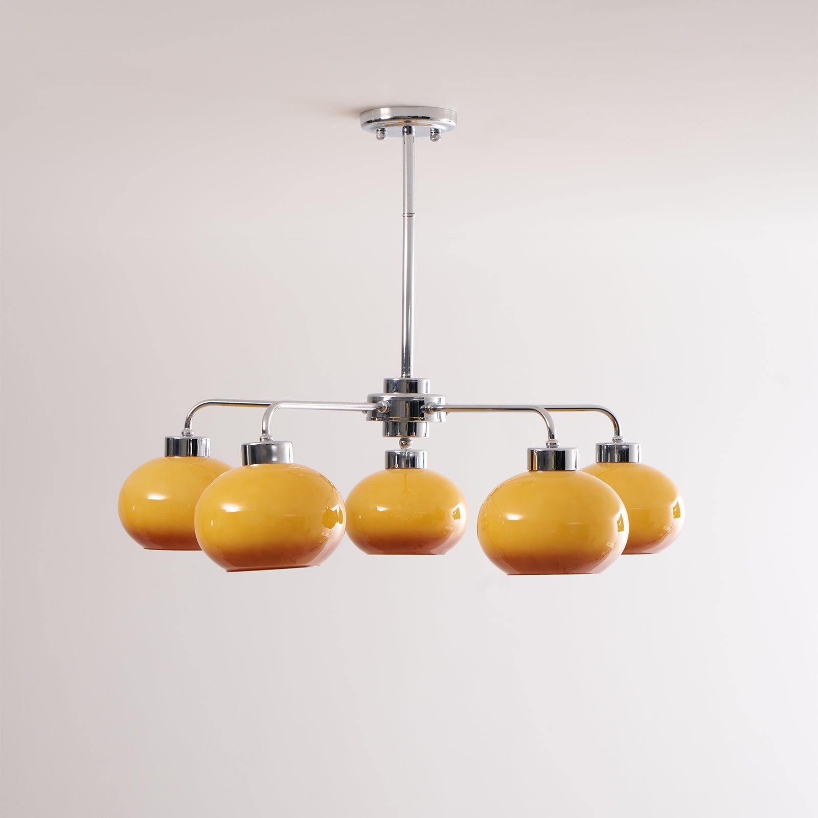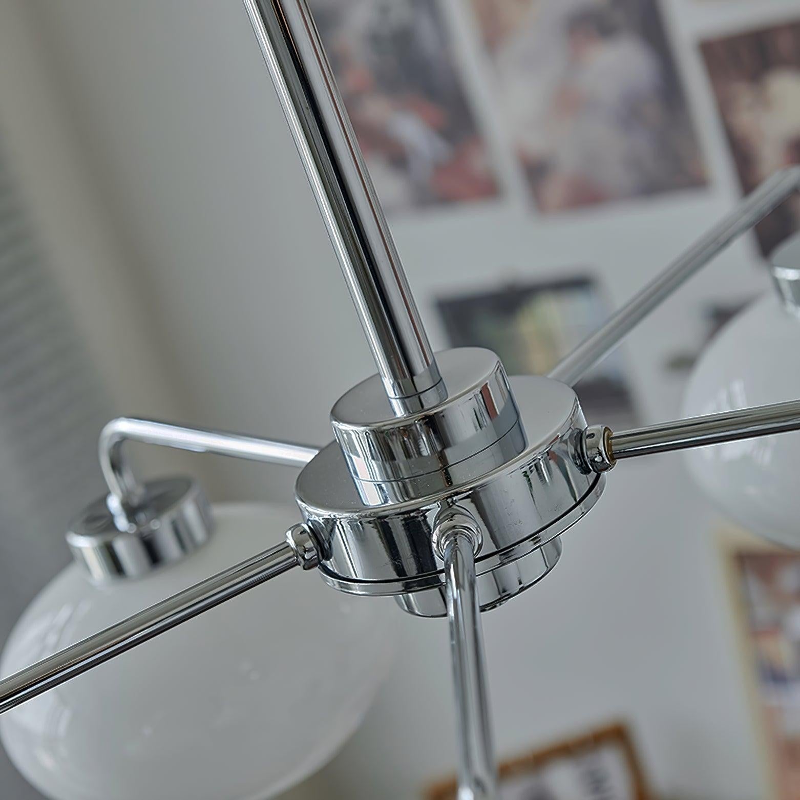 This chandelier blends mid-century elegance with sculptural simplicity. Smooth glass globes are arranged along a polished metal frame, creating a balanced, geometric silhouette that feels light yet expressive. It delivers soft, even illumination while acting as a striking centerpiece above dining tables or living spaces.