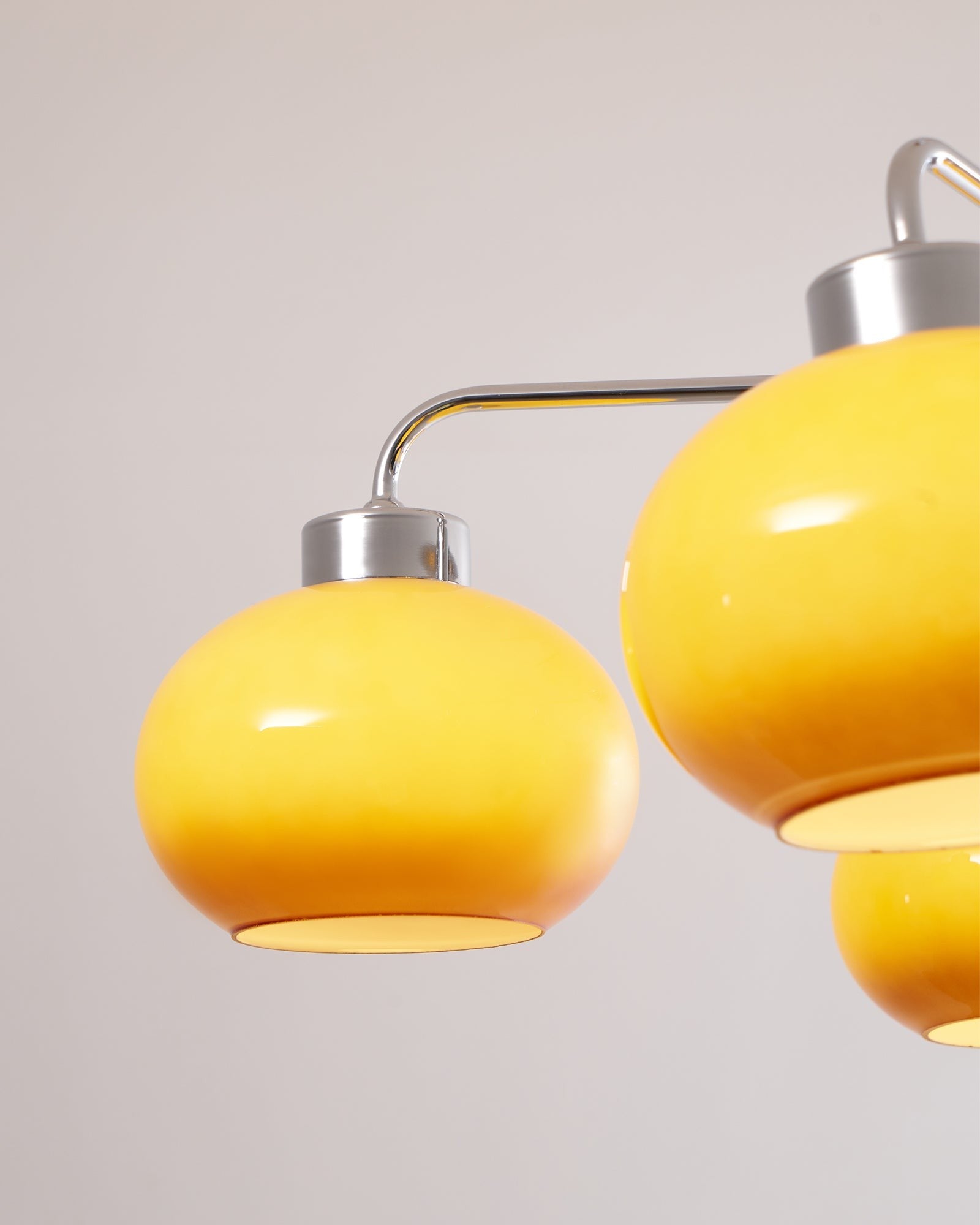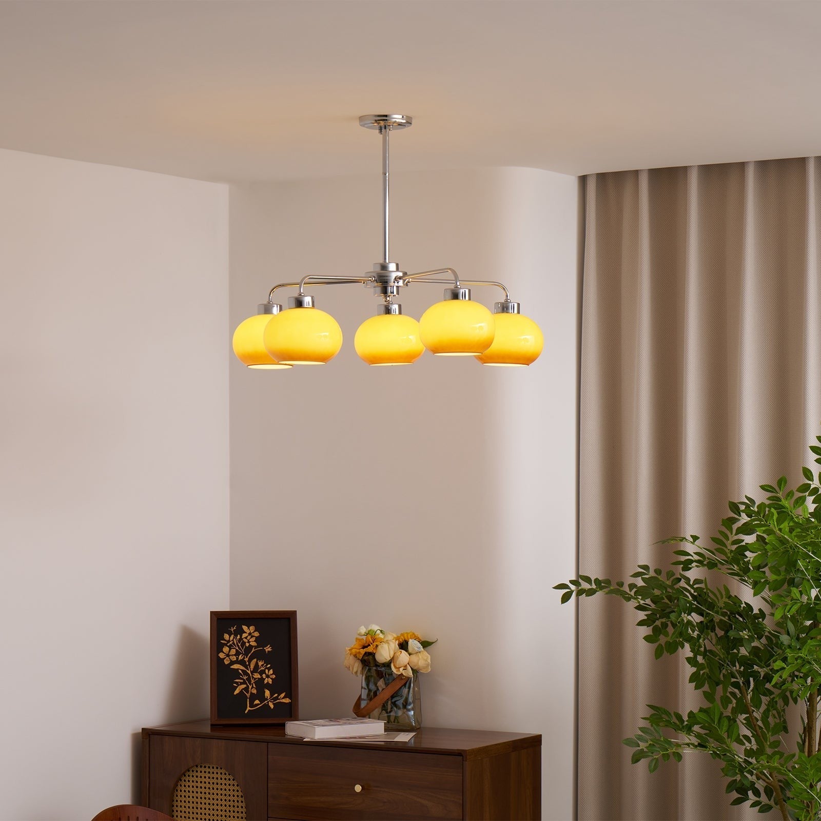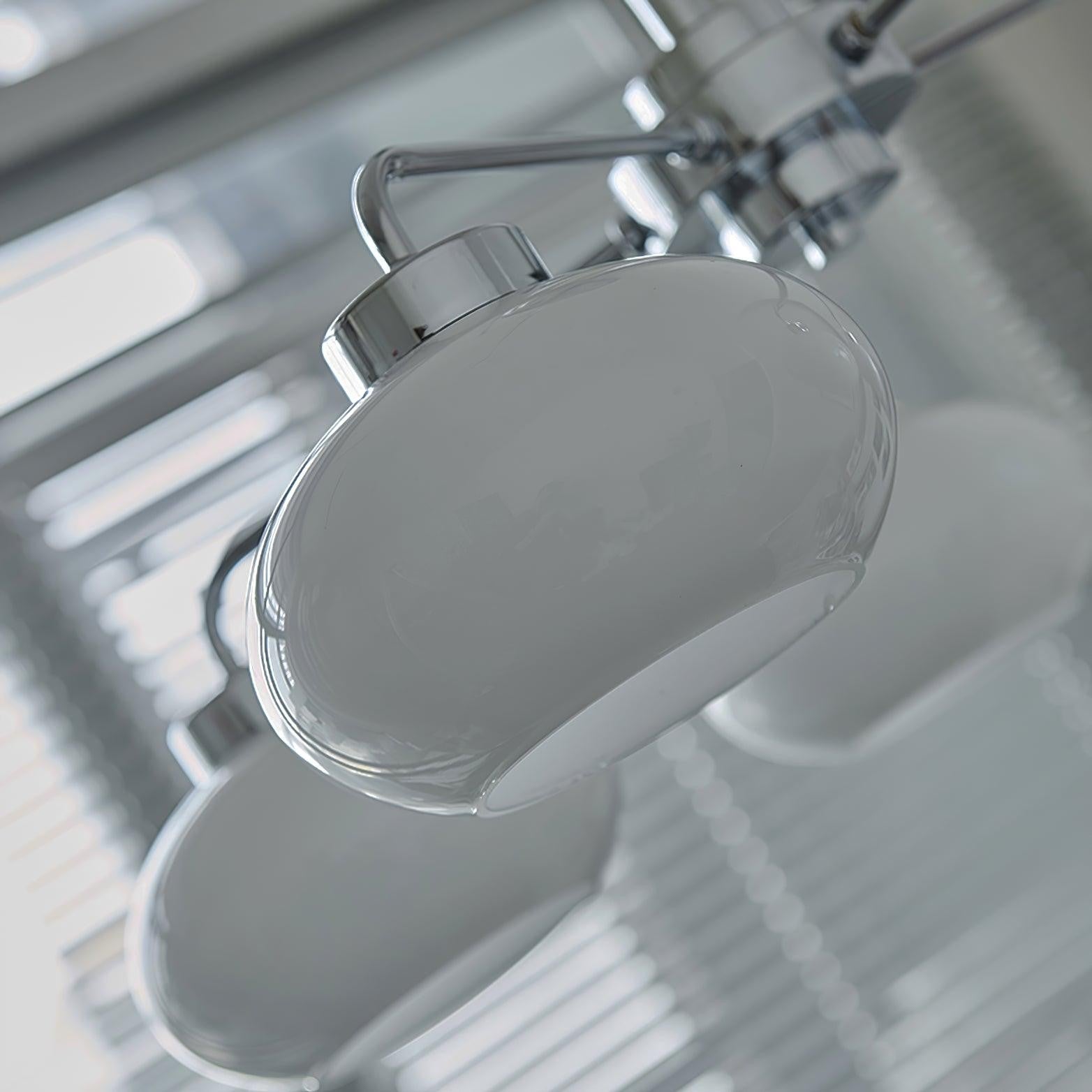 This chandelier blends mid-century elegance with sculptural simplicity. Smooth glass globes are arranged along a polished metal frame, creating a balanced, geometric silhouette that feels light yet expressive. It delivers soft, even illumination while acting as a striking centerpiece above dining tables or living spaces.
