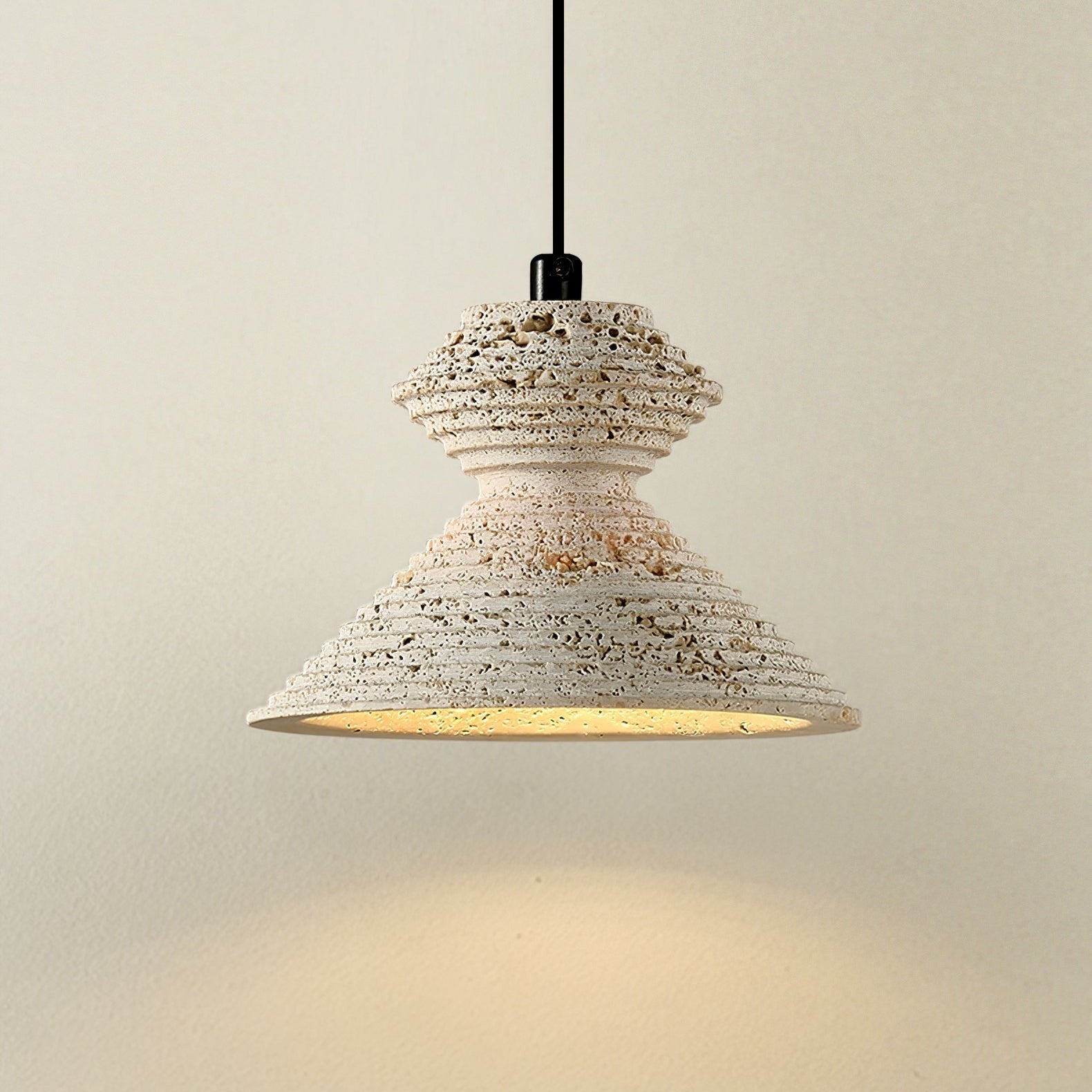 This pendant light celebrates the raw beauty of natural stone, shaped into clean, geometric forms that feel both grounding and refined. Each piece showcases unique travertine veining, giving the light a one-of-a-kind character. When illuminated, it casts a warm, earthy glow that adds depth and calm to kitchens, dining areas, or creative spaces.