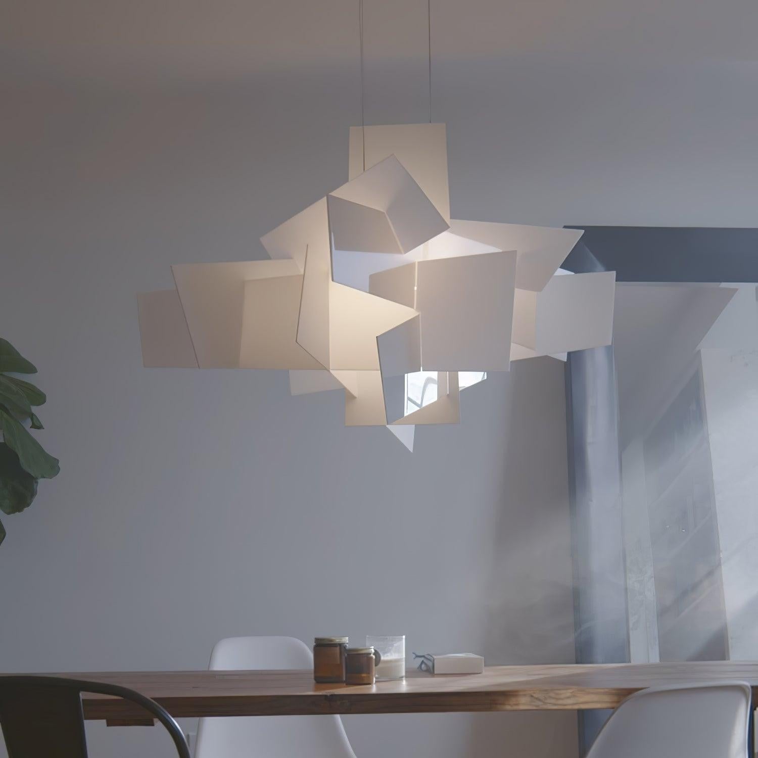 This pendant light feels energetic and artistic, with intersecting planes that radiate outward in a bold, sculptural form. Light reflects off its layered surfaces from every angle, creating depth and visual drama. Ideal for statement interiors, it turns overhead lighting into a striking design centerpiece.