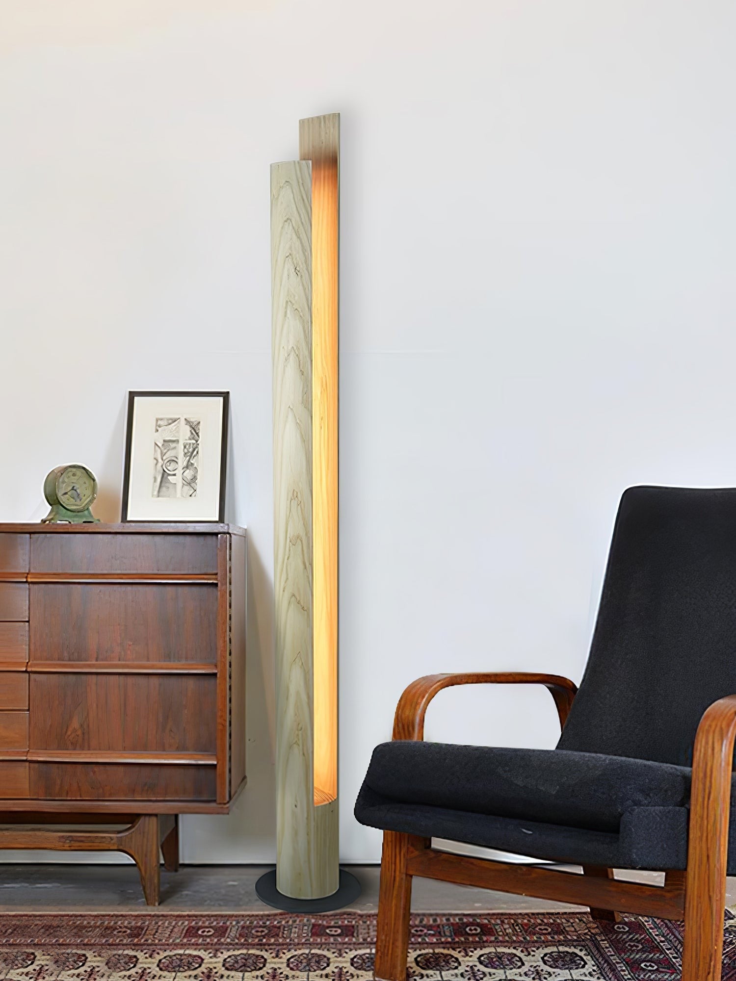This floor lamp makes a quiet architectural statement. A glowing wooden column rises from a solid marble base, offering soft, vertical illumination that feels calm and grounded. The natural materials and slender profile make it an elegant addition to living rooms or bedrooms where atmosphere is just as important as function.